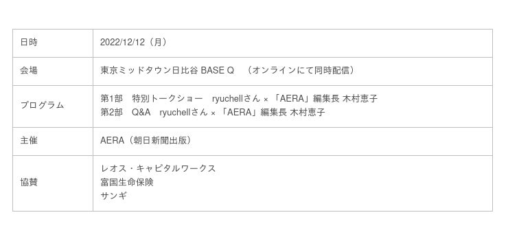 ニュース週刊誌「AERA(アエラ)」が主催する女性限定イベント「AERA働く女性応援プロジェクト ワーキングウーマンのための“新ライフマネジメント論”」。第13回は「“自分推し”になろう ~ryuchellさんと語る自分を大切にするマイルール~」と題し、2022年12月12日(月)にリアル会場とオンライン同時配信のハイブリットイベントを開催いたしました。