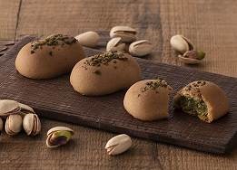 まゆの形をかたどった、一口サイズのお饅頭。ピスタチオを使ったまろやかな香ばしい一品です。