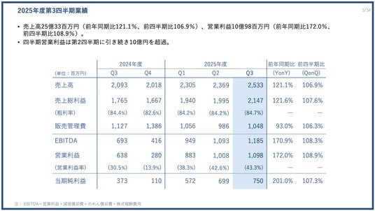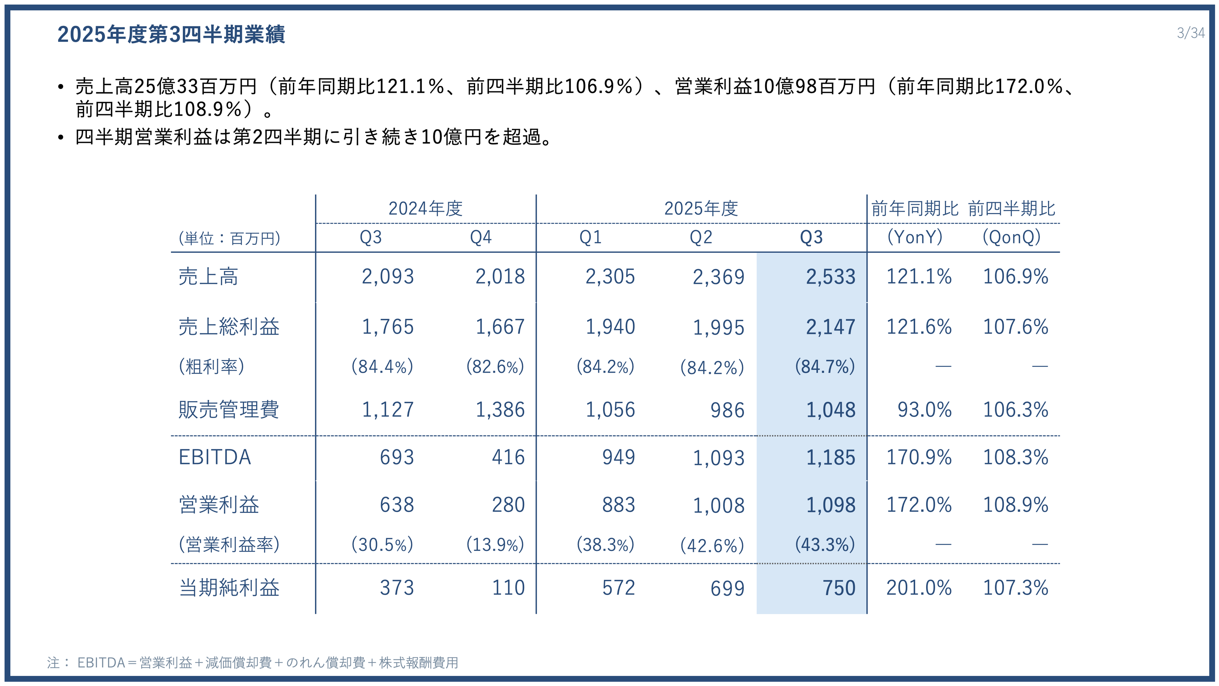 2025年度第3四半期の業績は、売上高25億3300万円、EBITDA11億8500万円、営業利益10億9800万円、当期純利益7億5000万円となりました。営業利益が第2四半期に続いて10億円を超える結果となりました。
