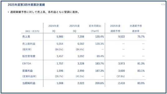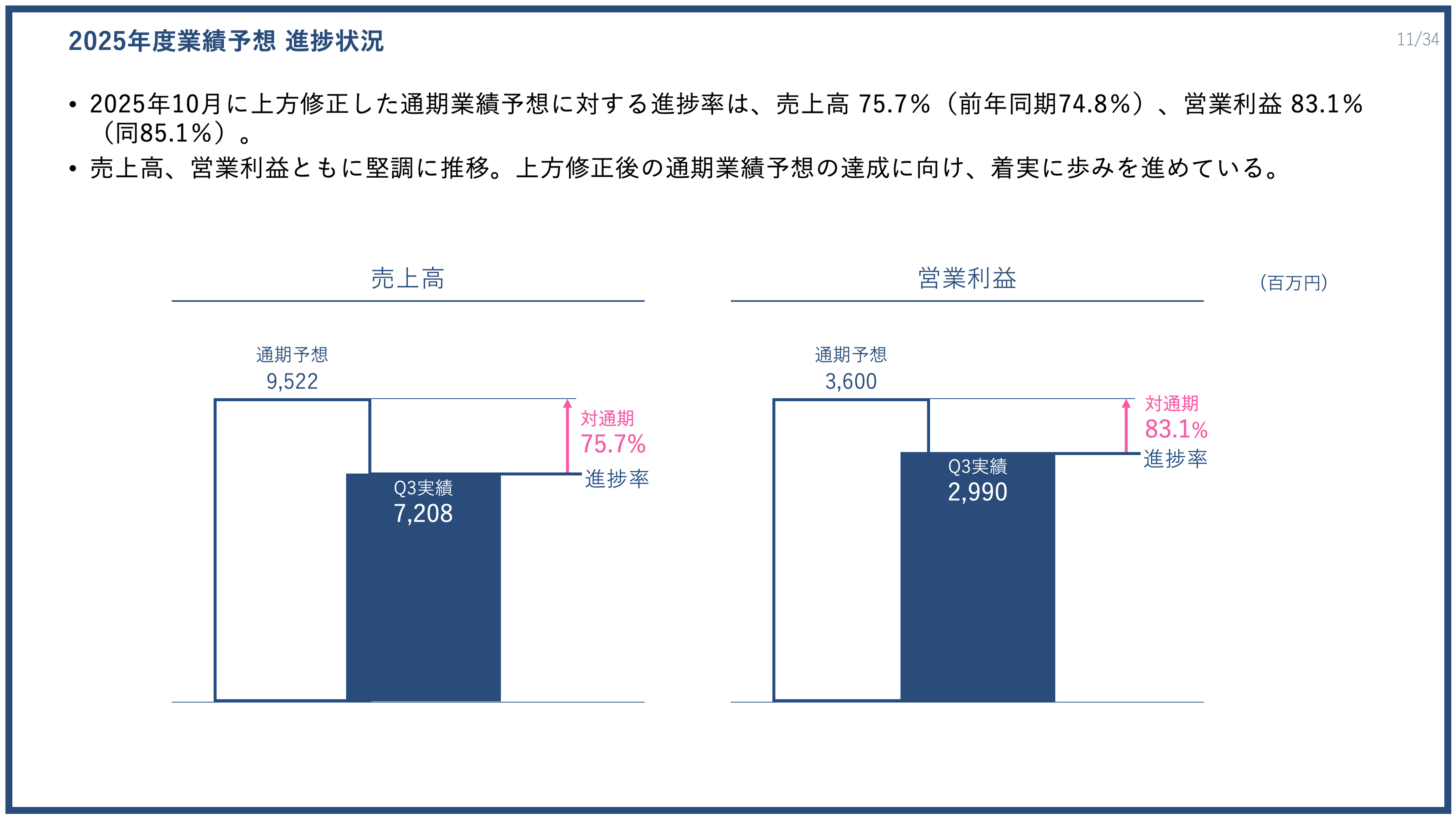 2025年度第3四半期が経過して業績予想に対して、順調に進捗しています。売上高は2025年10月に上方修正した通期予想95億2200万円に対し、進捗率は75.7%(前年同期74.8%)。営業利益は通期予想36億円に対し、進捗率は83.1%(前年同期85.1%)となっています。