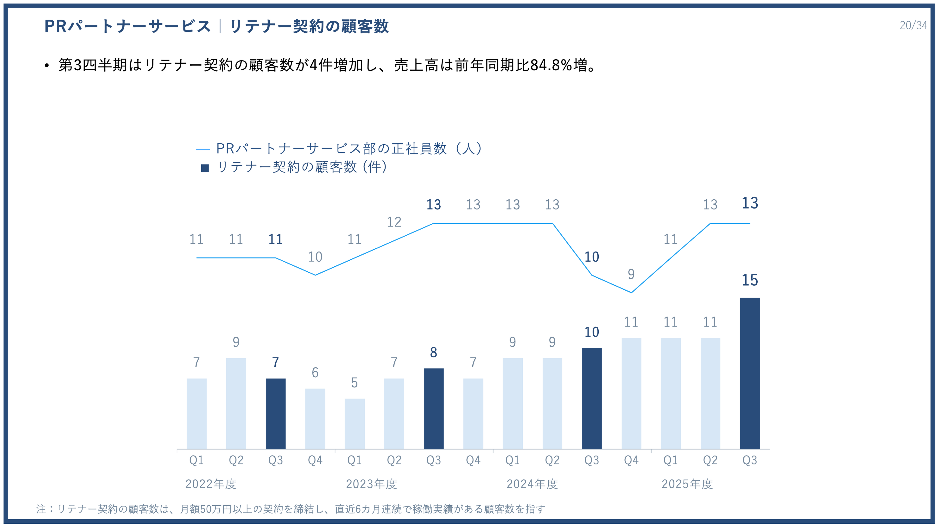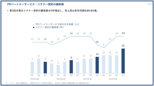 第3四半期はリテナー契約の顧客数が15件と前四半期から4件増加し、売上高は前年同期比84.8%増となりました。正社員数の増減はなく、データとAIを活用したサービス開発、そしてメンバーの能力トレーニングを両輪で進めながら、顧客創造に挑んでいます。