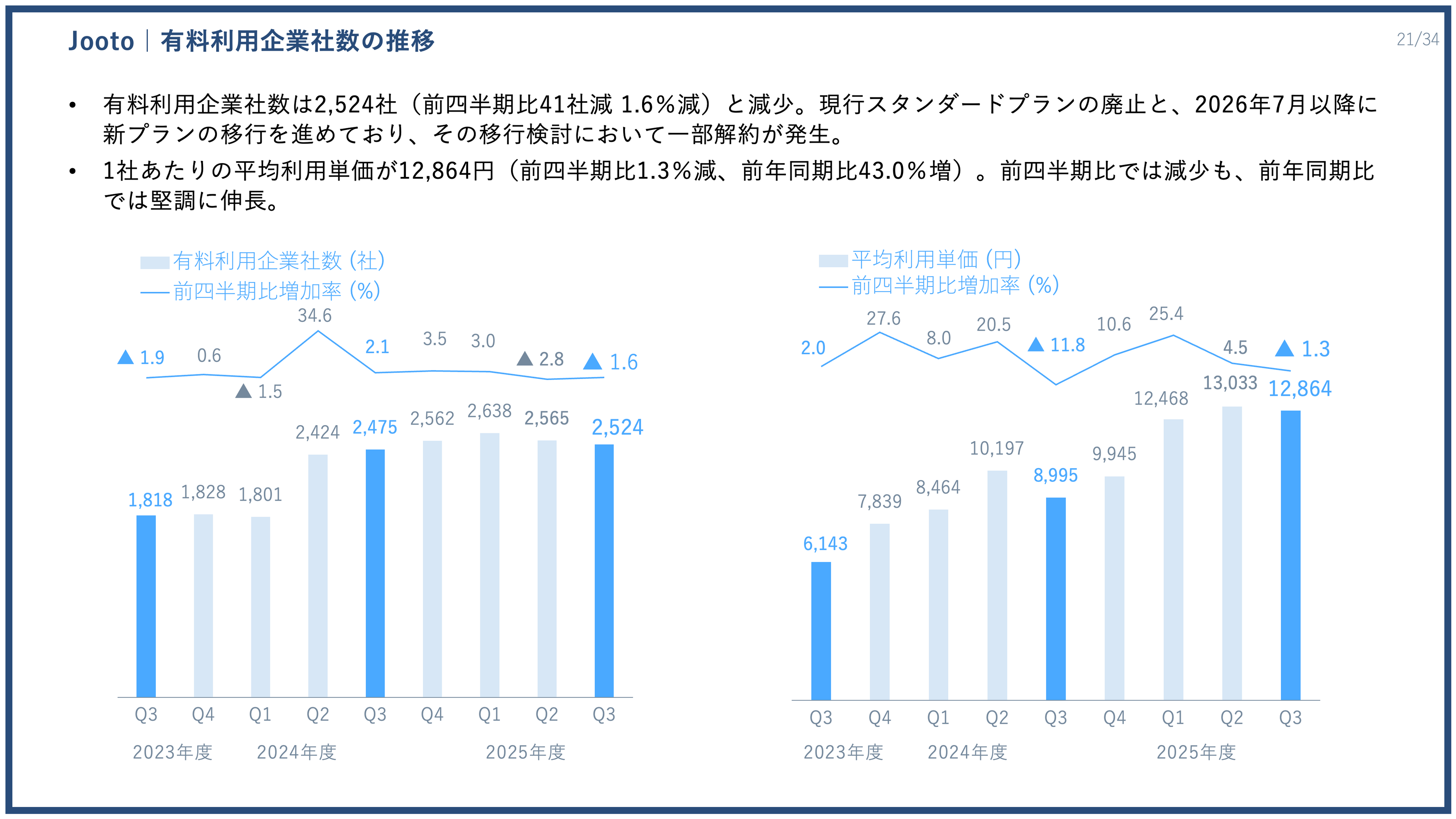2025年11月末時点で有料利用企業社数は2524社と、前四半期比で41社減(1.6%減)となりました。現行スタンダードプランの廃止と、2026年7月以降に新プランの移行を進めており、その移行検討において一部解約が発生しました。