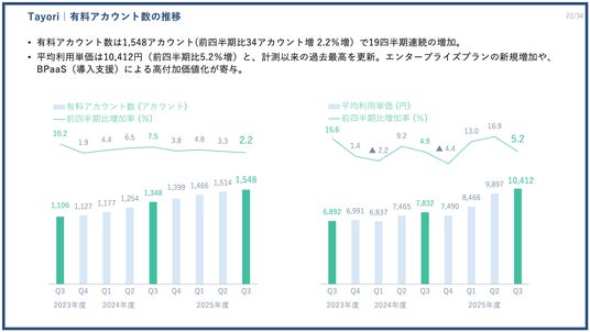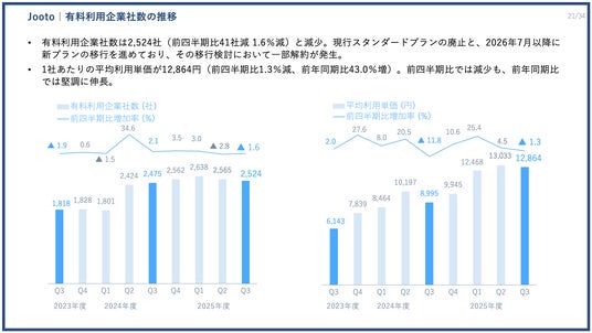 - Jootoの有料利用企業社数は2524社(前四半期比1.6%減)、平均利用単価は1万2864円(同1.3%減)。Tayoriの有料アカウント数は1548アカウント(同2.2%増)、平均利用単価は1万412円(同5.2%増)。