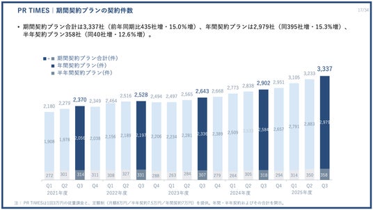 「PR TIMES」には1回3万円の従量課金プランと定額課金のプランがあり、定額課金は単月契約の月額8万円、半年契約の月額7万5000円、年間契約の月額7万円に分かれています。年間契約プランと半年契約プランとその合計を開示します。期間契約プランの利用は、引き続き堅調に拡大しています。
