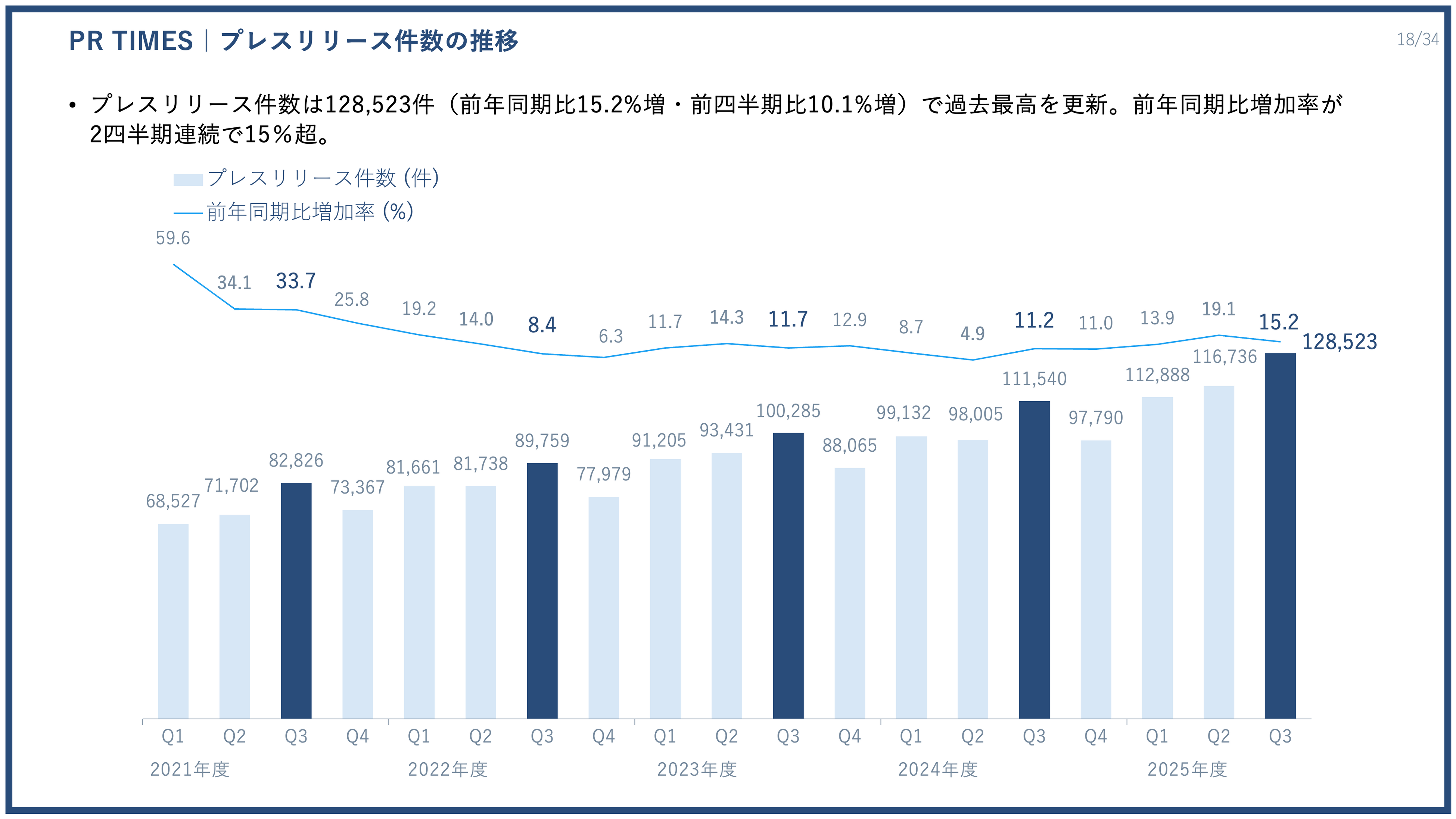 2025年度第3四半期のプレスリリース件数は、12万8523件(前年同期比15.2%増、前四半期比10.1%増)で過去最高を更新しました。成長率としては、前年同期比増加率が2四半期連続で15%を超えています。