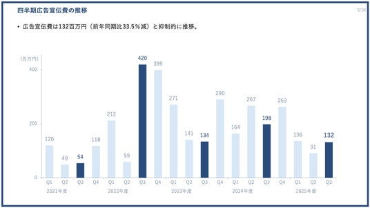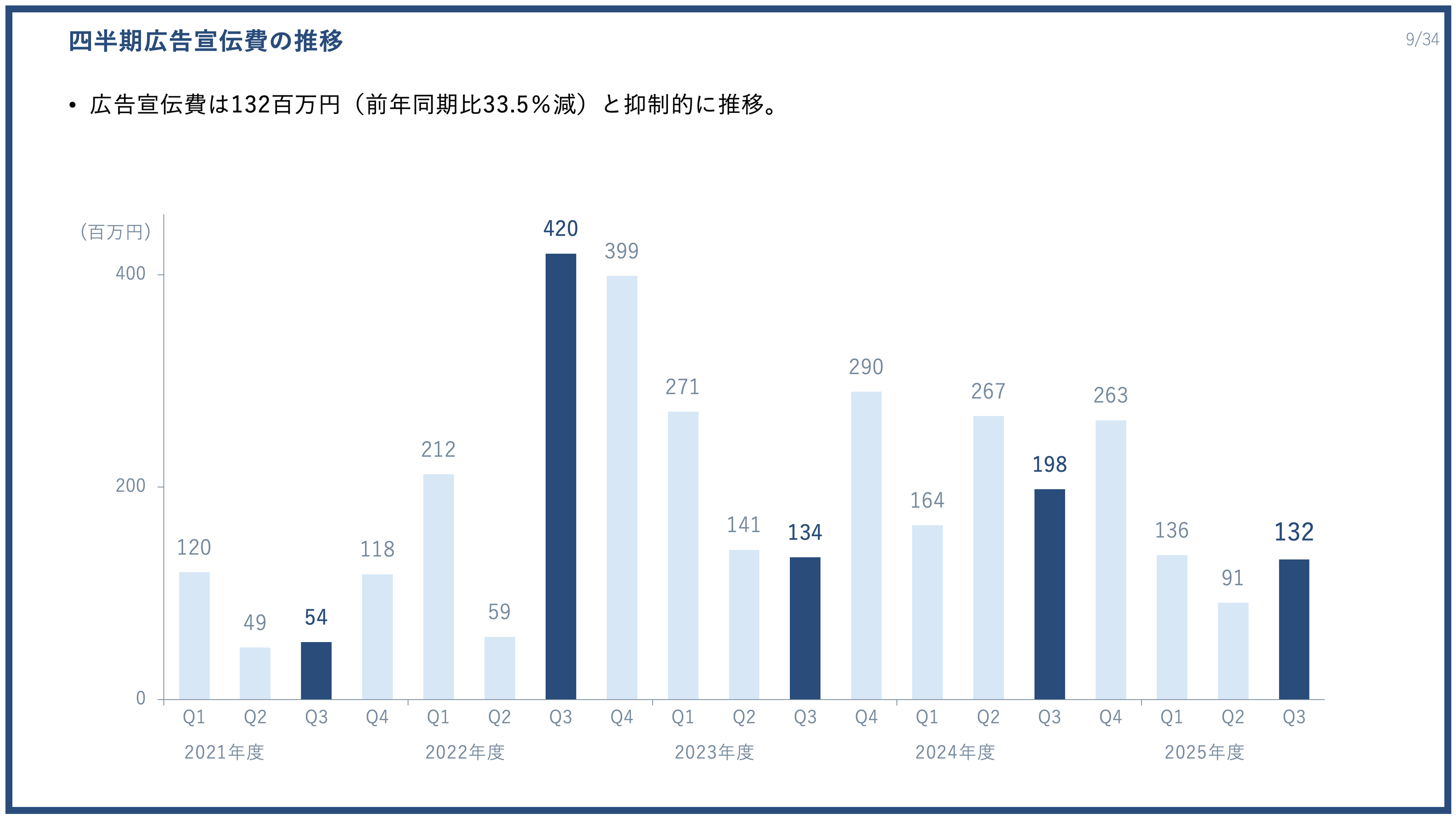 S&Mの中で、四半期の広告宣伝費は1億3200万円、前年同期比で33.5%減と、計画的に広告投資を行い、前年と比べて抑制しました。