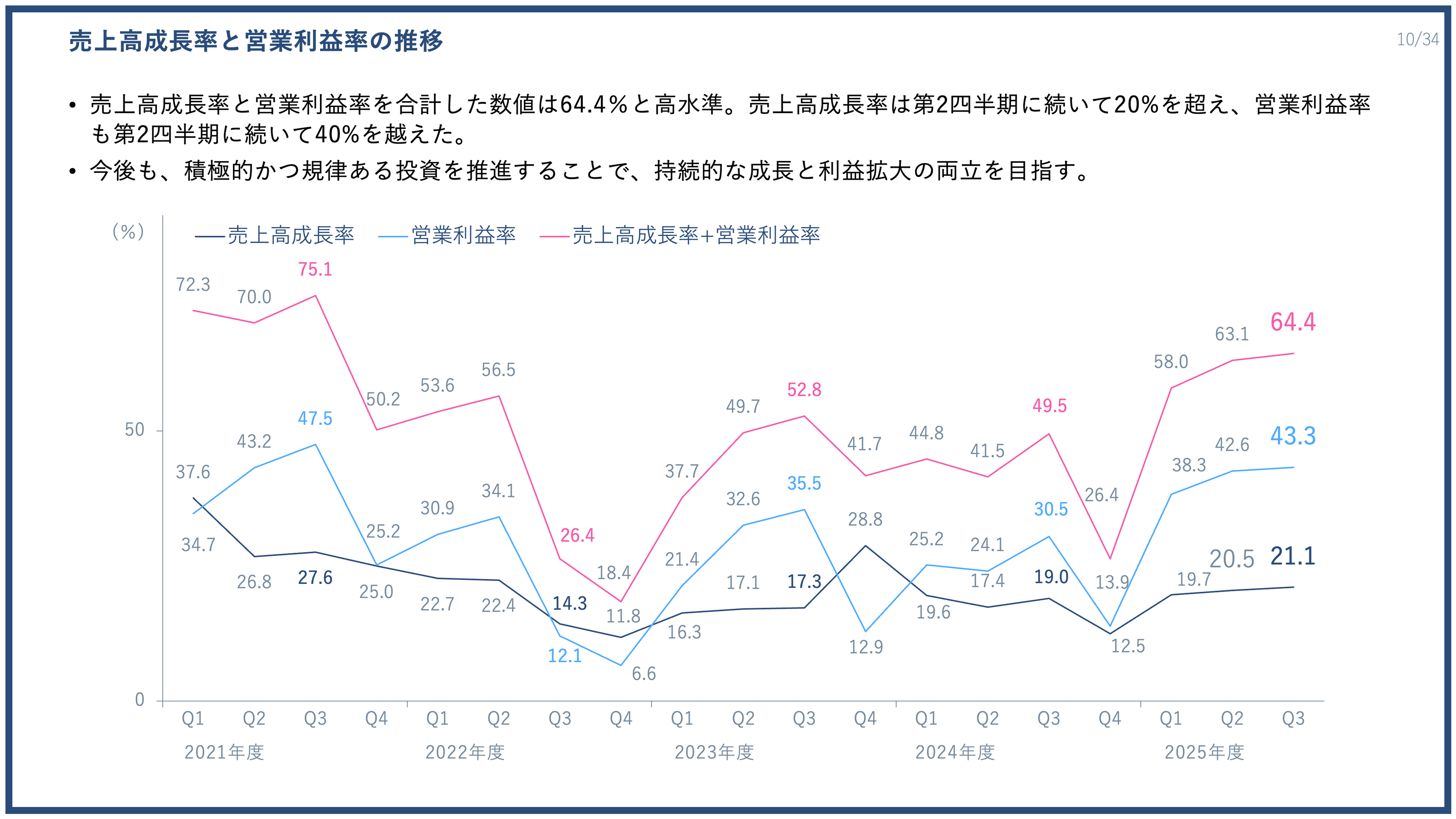 売上高成長率と営業利益率を合計した数値は第3四半期で64.4%と、非常に高い水準となりました。引き続き、積極的かつ規律ある投資により持続的成長と利益拡大の両立を目指してまいります。