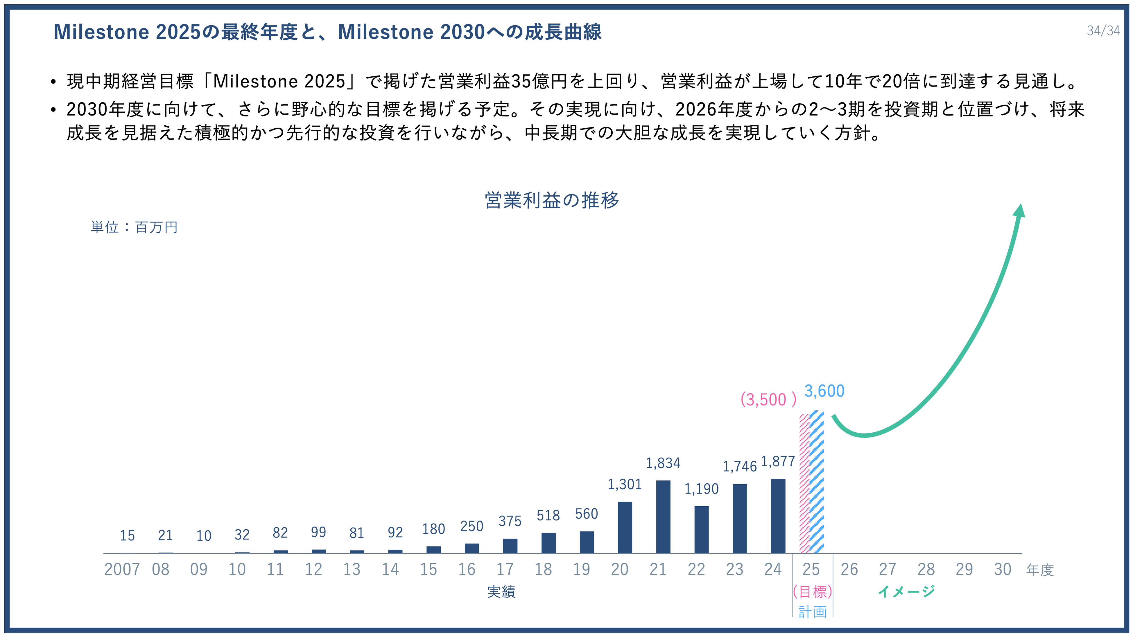 2025年度は営業利益は上方修正し、36億円を見込んでいます。中期経営目標「Milestone 2025」で掲げた35億円を上回る見通しで、上場から10年で営業利益が20倍の水準に達しようとしています。