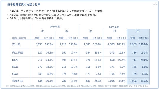 S&Mは、プレスリリースアワードやPR TIMESカレッジ等の主催イベントを実施しました。R&Dは、開発の内製化で一時的に減少しておりますが、足元では回復傾向にあります。G&Aは、対売上高比で10%未満を維持しています。売上高比率は、S&Mが28.2%。R&Dが6.9%。G&Aが6.3%です。