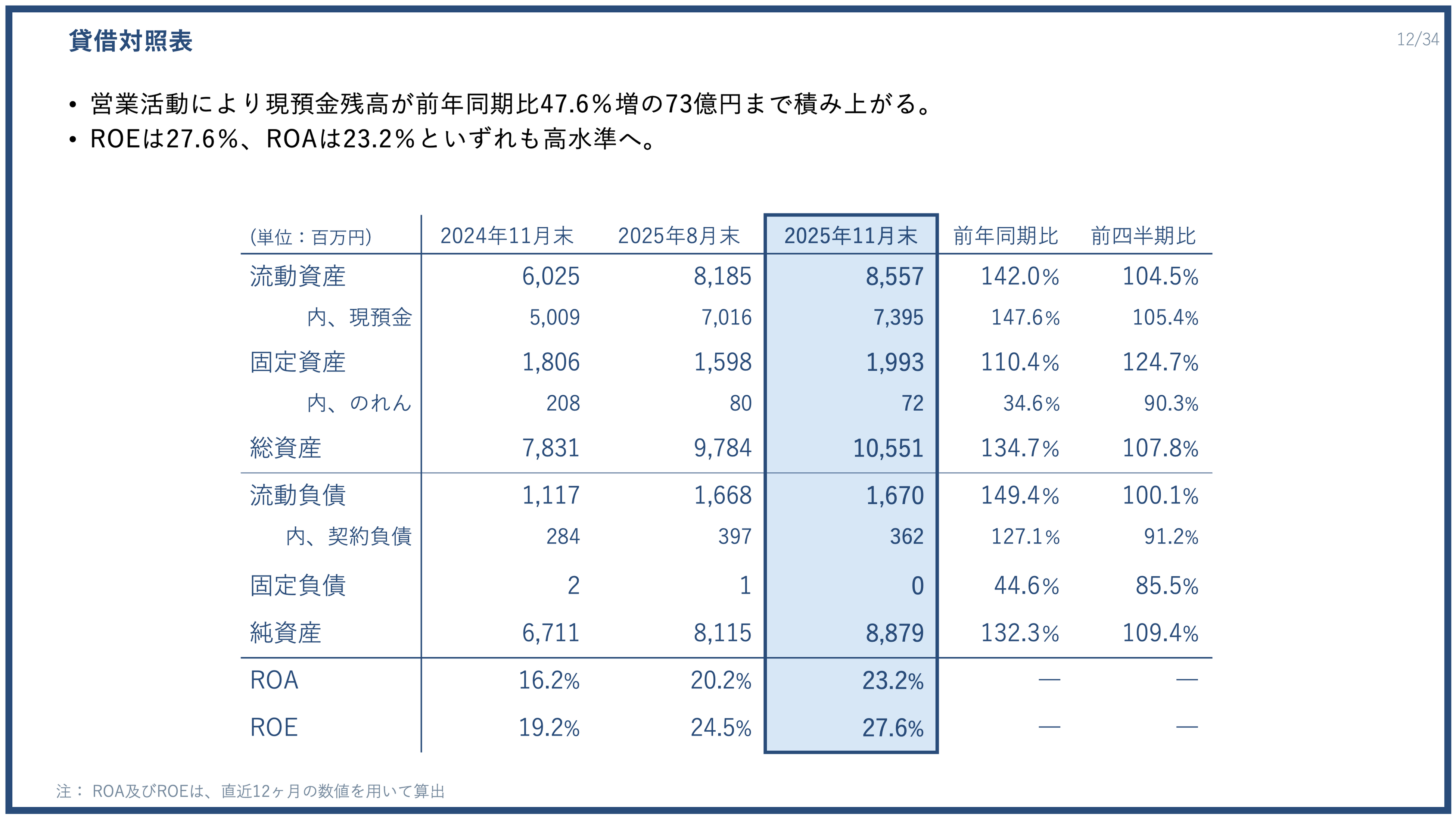 ROEは27.6%、ROAは23.2%と、いずれも高い水準で、資本効率と収益性の両立を示しています。