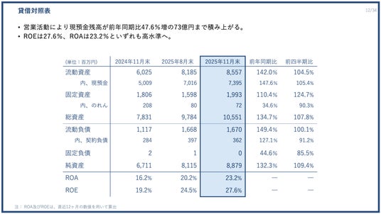 業績概況の最後に、バランスシートを紹介します。営業活動により現預金残高が、前年同期比47.6%増の73億円まで積み上がっています。