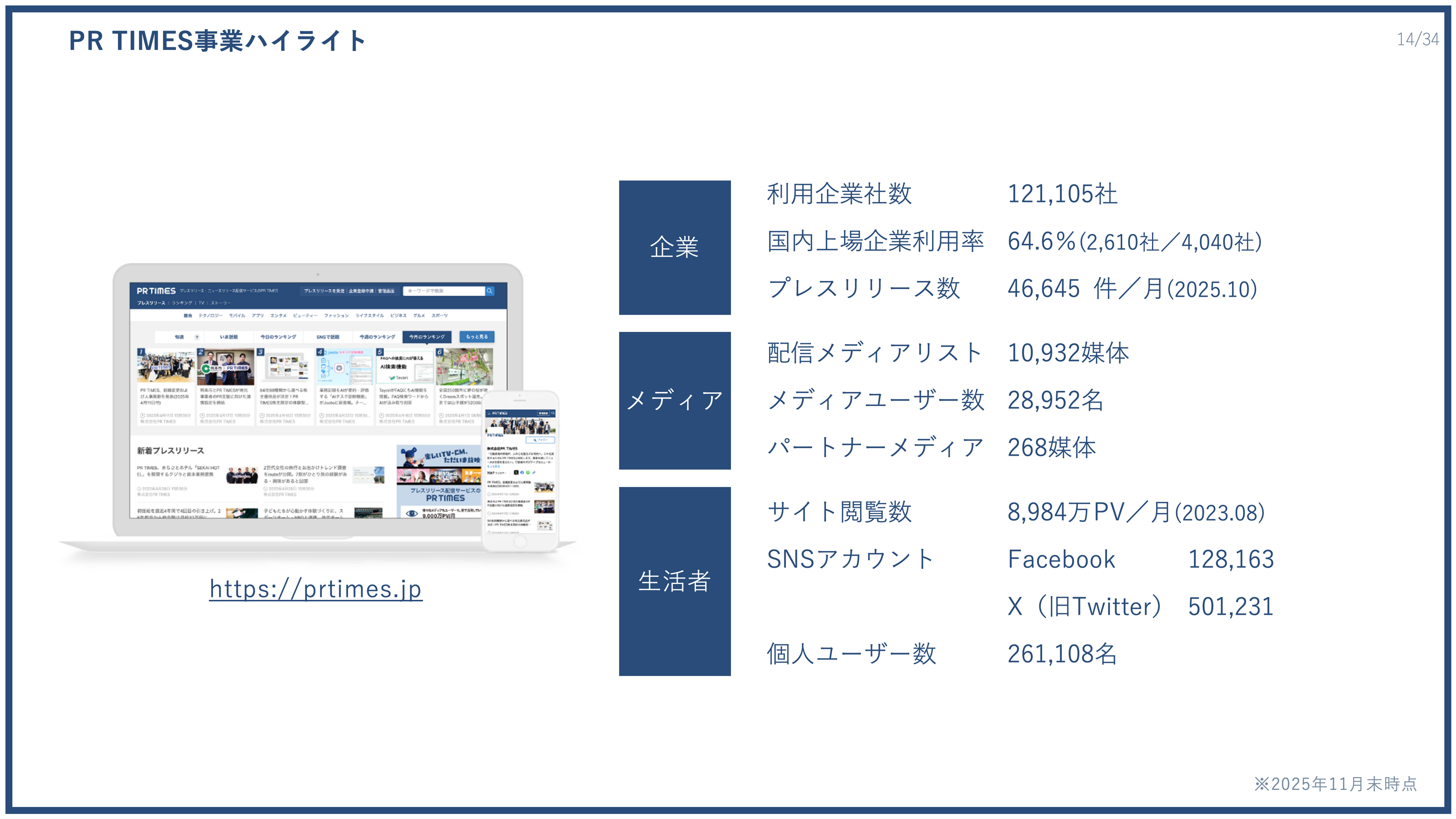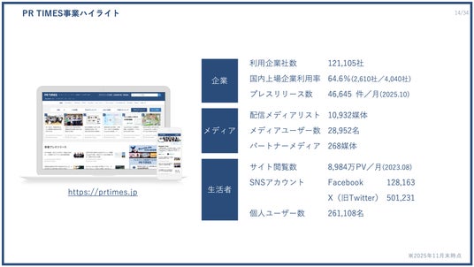 「PR TIMES」利用企業数は2025年11月末時点で12万1105社となり、前年同期比で1万6044社の増加、前四半期比で4175社の増加になっています。また11月末時点で、国内上場企業のうち64.6%にご利用いただいております。