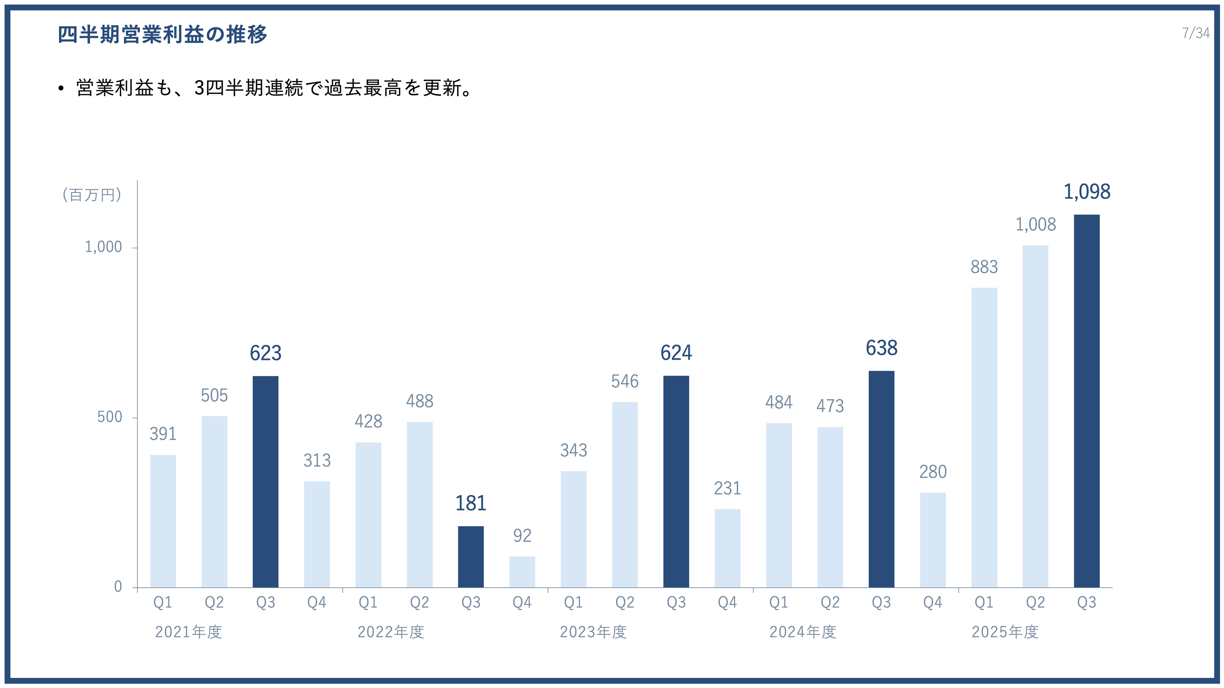 四半期売上高の推移では、3四半期連続で過去最高を更新しており、堅調に成長基調を継続しています。