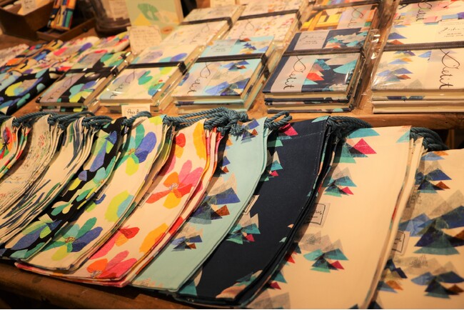 京都の風景をモチーフとしたデザインが施されたトートバッグやスマホケースなど、バリエーション豊かな小物の数々に癒されます。