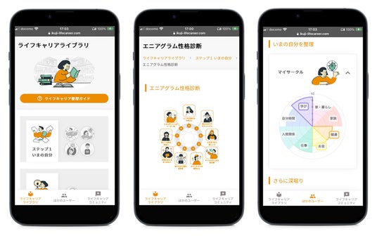 「ライフキャリアライブラリ」は、仕事と育児をどのように両立していきたいか、思い描く理想の自分を明確にするための自己分析ノートツールです。国家資格を持つキャリアコンサルタントが監修した質問に答え、他ユーザーのライフキャリアも参考にしながら、自分のライフキャリアを考えるきっかけやヒントを得ることができます。