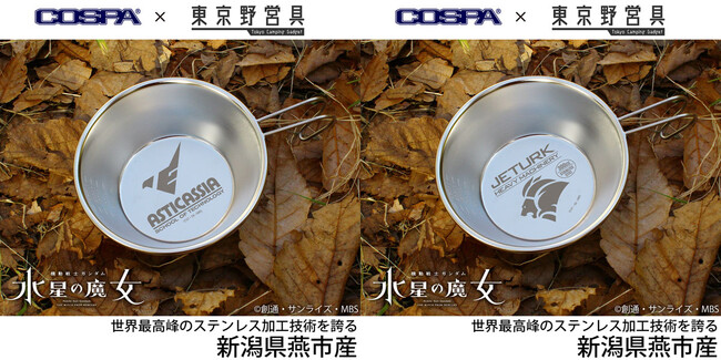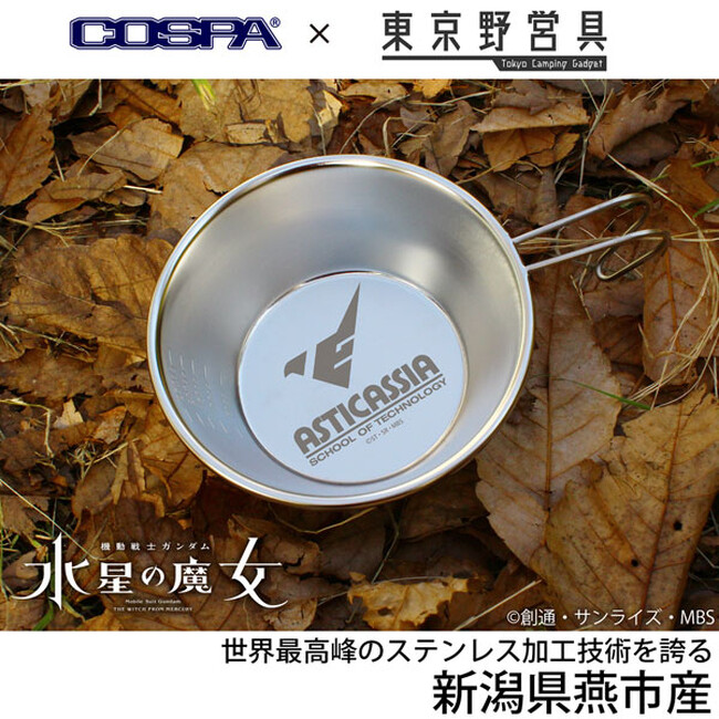 「アスティカシア高等専門学園」「ジェターク社」のマークがそれぞれプリントされた新潟県燕市製のシェラカップ。