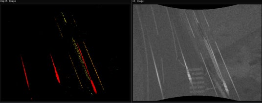 「ハイブリッドToF(R)」センサー電線検知画像(左:センサー画像、右:カメラ画像)