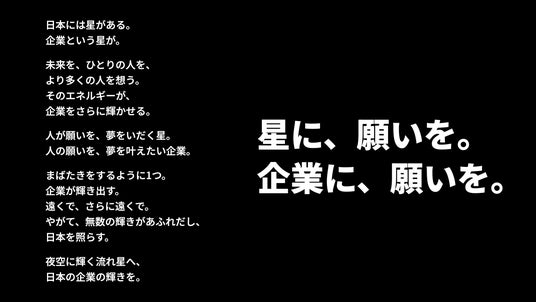 具体的には、流れ星を近く臨む最も高い眺望台等で、「地上の星(=企業)」と「夜空の星」を一緒に鑑賞するイベントや、企業を星の一つに見立てて作った星座を上空から鑑賞できるイベントなどを計画しており、詳細はおよび賛同企業の募集開始は、順次プレスリリースなどで発表していきます。