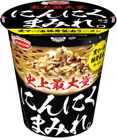 ラーメン好きには堪らない“にんにく”を史上最大量※加え、さらに黒マー油で仕上げた、コクのあるスタミナ感溢れる豚骨醤油ラーメンです。パッケージは、大量のにんにくのシズル写真と、“にんにくまみれ。”を前面に押し出したデザインに仕上げました。