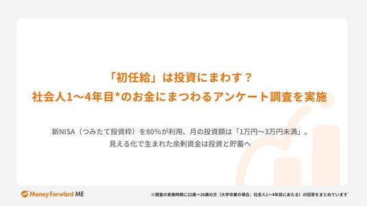 マネーフォワードホーム株式会社は、22~26歳の『マネーフォワード ME』ユーザー(※1)に向けて、初任給や投資・貯蓄、お金にまつわる習慣や価値観についてアンケート調査を実施しました。