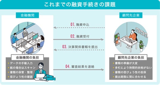 従来の与信審査プロセスでは、顧問先企業や会計事務所から金融機関への決算関係書類の提出は郵送で行われており、金融機関は紙書類のスキャニングや社内システムにデータを手動で入力する負担が発生していました。