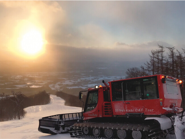 雪上車に乗って朝日を望むツアー。小高倉山から望むご来光はまさに非日常空間。下りはスキー滑走も可能です。