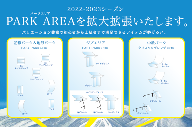 今シーズンは、初級者から上級者まで満足できるようパークエリアを拡張し、初級エリアに開設予定のバンクやロールなど3感覚を身につける練習に最適な地形を活かしたアトラクションアイテムを揃えております。