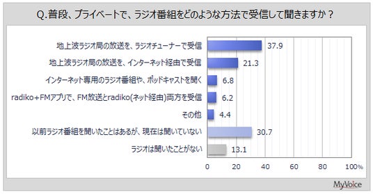 受信方法は(複数回答)、地上波ラジオ放送を「ラジオチューナーで受信」が37.9%、「インターネット経由で受信」が21.3%です。
