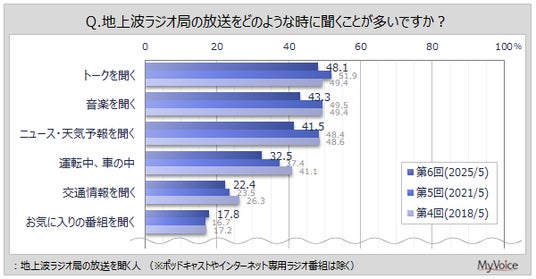 マイボイスコム株式会社(東京都千代田区、代表取締役社長:高井和久)は、6回目となる『ラジオの利用』に関するインターネット調査を2025年5月1日~7日に実施しました。