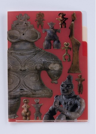 上のポケットに白地の書類などを入れると背景の赤色が消え、いっそう土偶が浮かび上がる。