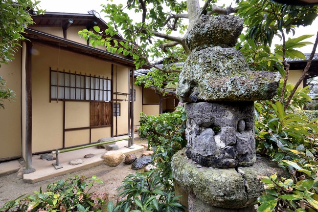 大阪府堺市「南宗寺」にて、利休の師・武野紹鷗(じょうおう)の屋敷にあったと伝わる石灯籠。風化が進んでいるが、刻まれた六地蔵が確認できる。左奥は利休好みの茶室「実相庵」。