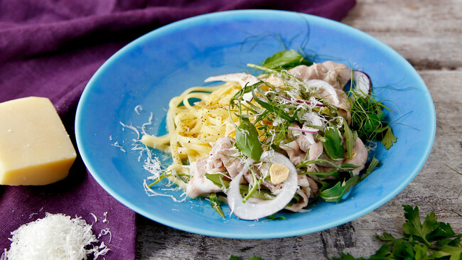 天然のゆず・すだちの果汁を主原料とし、純正しょうゆ・かつおだし・こんぶだしをブレンドしたポン酢『センザンゆずポン酢』を使った、豚しゃぶ生パスタ。