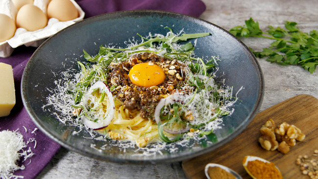 ■淡路産牛のスパイシーミートソース 北坂卵黄のせ 島ハーブの香り