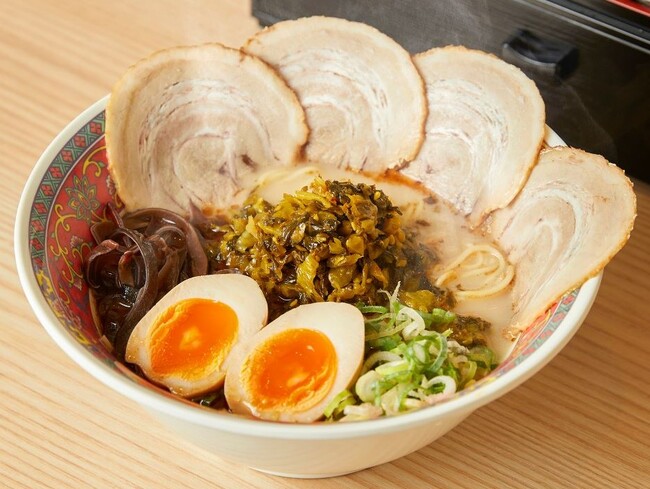 うまさの秘密はマー油。芳醇なとんこつスープとよく絡む中太麺に高菜もトッピング。