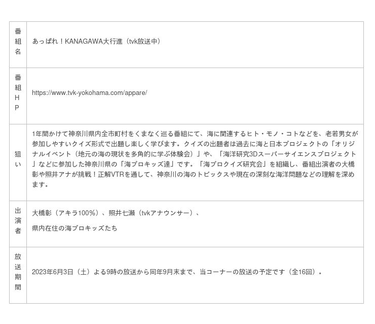一般社団法人海と日本プロジェクトinかながわは、6月3日(土)よる9時よりtvk(テレビ神奈川)にて神奈川県内の全市町村をブラ歩きする人気番組「あっぱれ!KANAGAWA大行進(出演:大橋彰(アキラ100%)、照井七瀬(tvkアナウンサー)」内にて、日本財団「海と日本プロジェクト」と連携した新コーナー「あっぱれ!海プロQ 」を展開します。クイズの出題者は海に精通する県内在住の「海プロキッズ」たちで、海に関連するヒト・モノ・コトなどを、老若男女が参加しやすいクイズ形式で出題します。楽しく学ぶことで、神奈川県の海のトピックスや、現在の深刻な海洋問題などの理解を深めてもらうとともに、問題解決への参加意識を醸成します。