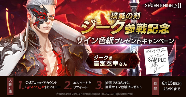 キャンペーン期間中に、『セブンナイツ2』公式Twitter(https://twitter.com/Sena2_JP)をフォローのうえ、キャンペーンツイートをリツイートしていただいた方の中から抽選で3名様に、高瀬泰幸さんの直筆サイン色紙をプレゼントいたします。