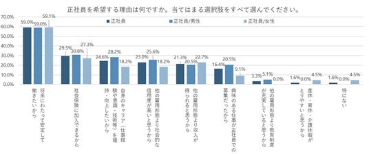 求人に応募した、正社員雇用を希望する人に、なぜ正社員を希望するのかをきいた(複数回答)。最も多かったのは「将来にわたって安定して働きたいから」が59.0%、次いで「社会保険に加入できるから」が29.5%、 「自身のキャリア(仕事経験や意識・技術等)を維持・向上したいから」 が24.6%となっている。長く安定して勤めたいという人が全体では6割で、半数以上の人が正社員としての長期就業を希望しているようだ。
