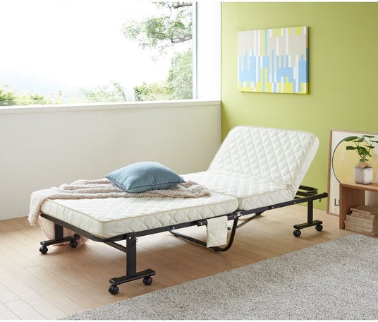 立ち座りのしやすさのヒミツは「40cm」。毎日の立ち座りのしやすさを考え、マットレスの位置をやや高めにしました。リクライニングや折り畳みが女性でもラクにできる軽量設計。低反発ウレタンをマットレスに使用したワンタッチ折り畳みベッドです。