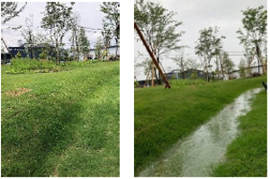 雨水を敷地外に出さずに浸透・貯留する庭園「レインガーデン」は、公共下水道への負荷低減や水害発生の抑制に貢献しています。