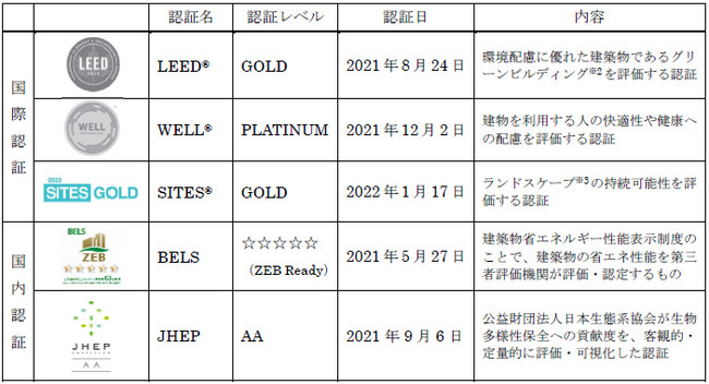 なお、本施設は国内認証である「BELS」(省エネルギー)や「JHEP」(生物多様性)と合わせて5つの認証を取得しています。