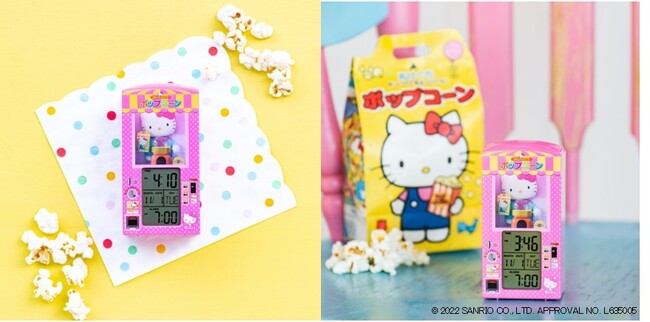 ボタンやお金の投入口などの細かい部分までプリントで再現。アラーム音は、あのおなじみの音楽と「できたてのポップコーンはいかが?」というハローキティのかわいいボイスが流れます。ちょうどいいサイズ感で、ベッドサイドで朝の目覚まし時計に、勉強や作業の時間管理に、置いておくだけでもかわいいインテリアのアクセントとして、暮らしのさまざまなシーンで活躍します。毎朝、一日の始まりがもっと楽しくなる目覚まし時計です。