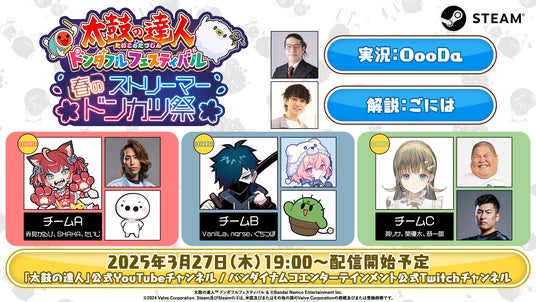 昨年11月に発売したSTEAM(R)版の「ドンフェス」と、「太鼓の達人 専用コントローラー 太鼓とバチ」を使用して3人1チームで戦うリズムゲーム対決やパーティゲームでの対戦といった、盛り上がること必至の生配信をお届け!