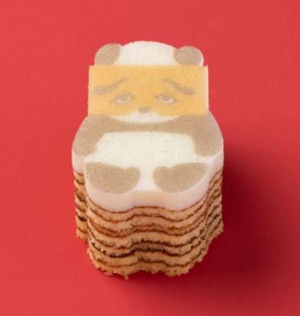 卵とアーモンドがふんわりと香るプレーン生地を、丁寧に焼き重ねた平焼きバウム。いちばん上の真っ白生地をキャンバスにして、二○加のお面をつけたパンダのプリントとカットをほどこしました。