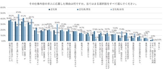 一方、「女性」のほうが「男性」よりも「自宅から通いやすいから」が21.3pt、「自分が求める福利厚生が充実していたから」が18.6pt、「企業理念、経営方針に共感したから」が11.5pt高くなった。特に通いやすさは約半数から支持されている。