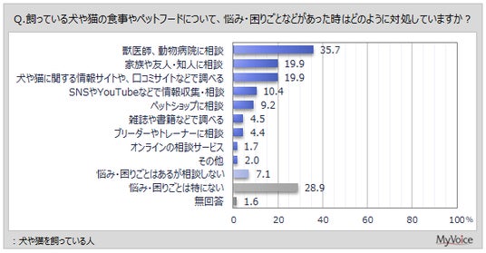 犬や猫を飼っている人に、食事やフードに関して悩みがあった時の対処法を聞きました(複数回答)。「獣医師、動物病院に相談」が35.7%、「家族や友人・知人に相談」「犬や猫に関する情報サイトや、口コミサイトなどで調べる」が2割です。