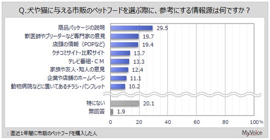 直近1年間にペットフードを購入した人の、フード選定時の情報源は(複数回答)、「商品パッケージの説明」が29.5%、「獣医師やブリーダーなど専門家の意見」「店頭の情報」が各2割弱で上位にあがっています。