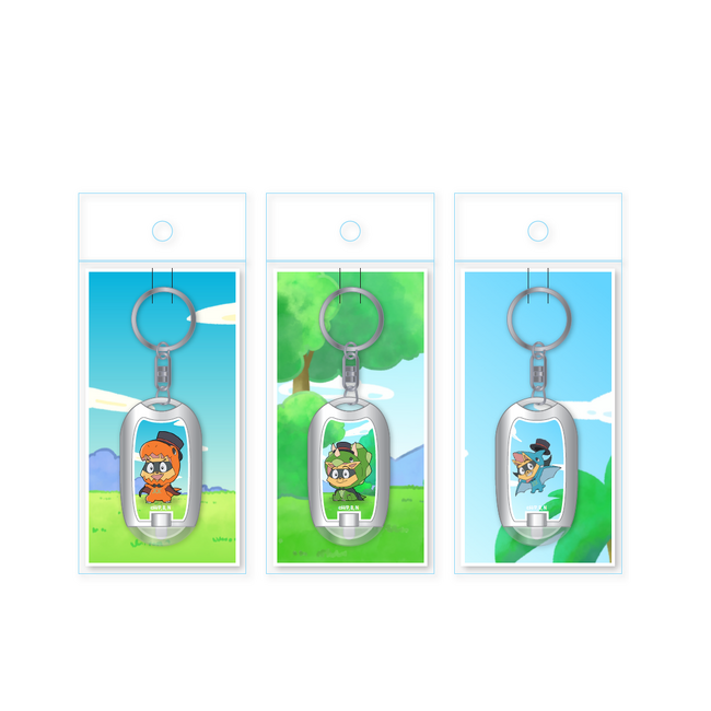 ・LED ライトキーホルダー3種(ティラノサウルス、トリケラトプス、プテラノドン):各800円(税別)