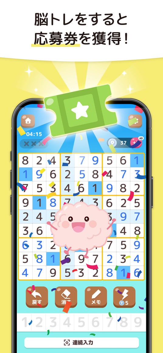 本アプリは、パズルゲームで脳トレを楽しみながら応募券を獲得し、懸賞に応募できるスマートフォンアプリです。