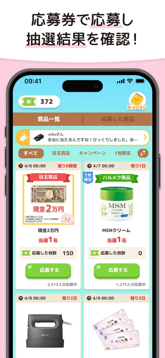 獲得した応募券で、ハルメクの人気定番商品や家電、日用品、ギフト券など豪華賞品に応募可能。透明性の高い抽選システムにより、安心・安全に懸賞を楽しめます。
