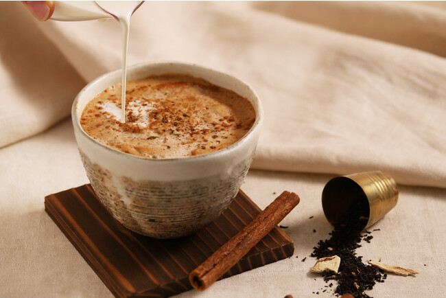 仕上げにシナモンと、「こななのくろ」をかけて、ピリッとスパイシーでほかほか温まるチャイになりました。